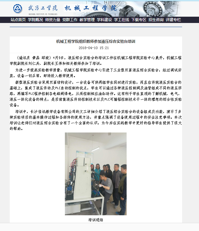 我公司給武昌工學院液壓綜合實驗臺的培訓工作在機械工程學院實驗中心展開,機械工程學院副院長劉仁兵、副院長王偉和相關教師參加了培訓。本次培訓讓老師們對液壓綜合實驗臺有了一個全面的認識,為今后在實踐教學中更好的指導學生提供了很大的幫助。