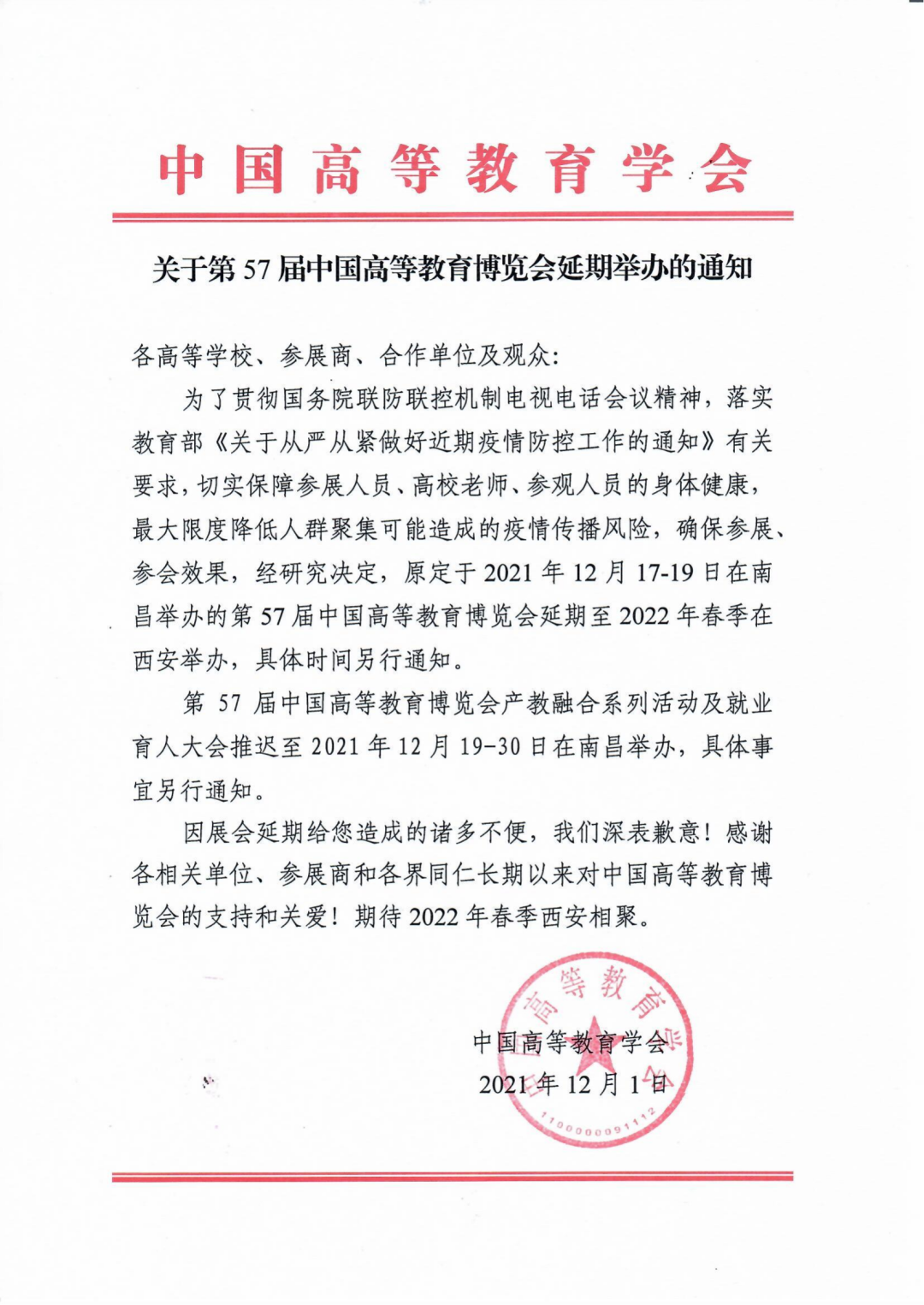第57屆中國高等教育博覽會延期舉辦的通知